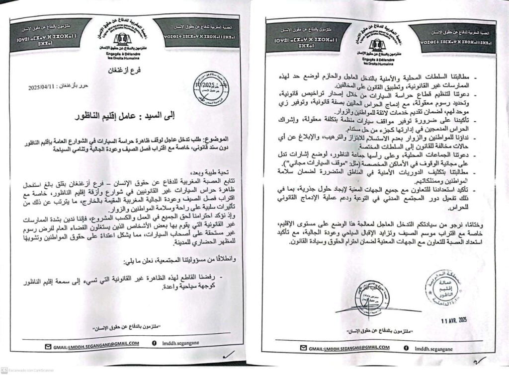 واوضحت العصبة في مراسلتها الموجهة لعامل اقليم الناظور والموقع بتاريخ 11 ابريل الجاري ،انها تتابع بقلق بالغ استفحال ظاهرة حراس السيارات غير القانونيين في شوارع وأزقة إقليم الناظور، خاصة مع اقتراب فصل الصيف وعودة الجالية المغربية المقيمة بالخارج، وما يترتب عن ذلك من تأثيرات سلبية على راحة وسلامة المواطنين والزوار.