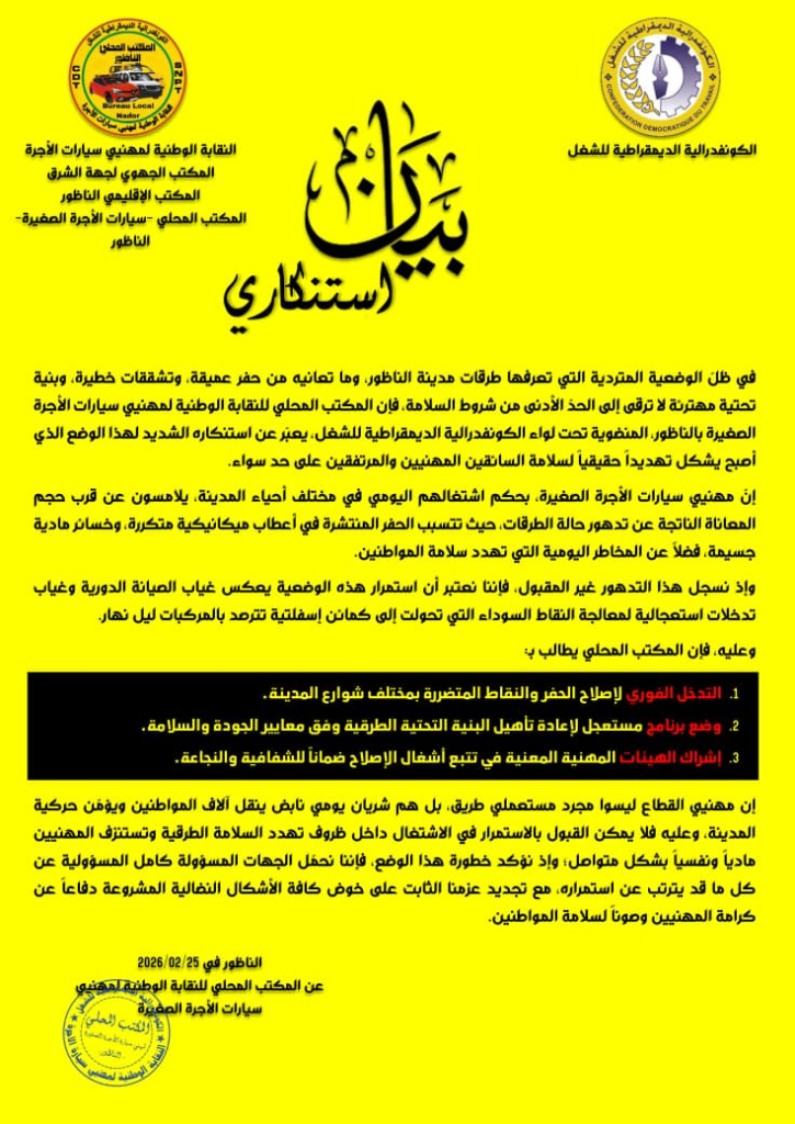 أصدر المكتب المحلي للنقابة الوطنية لمهنيي سيارات الأجرة الصغيرة بالناظور، المنضوي تحت لواء الكونفدرالية الديمقراطية للشغل، بلاغًا استنكاريًا عبّر من خلاله عن قلقه الشديد إزاء الوضعية المتردية التي تعرفها طرقات مدينة الناظور، والتي وصفها بأنها لا ترقى إلى الحد الأدنى من شروط السلامة الطرقية.