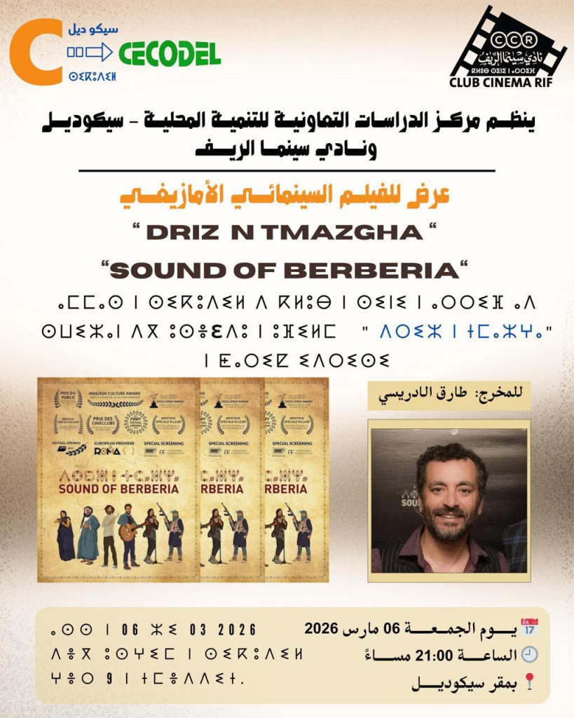 ينظم مركز الدراسات التعاونية للتنمية المحلية- سيكوديل بشراكة مع نادي سينما الريف عرضًا سينمائيًا خاصًا للفيلم الأمازيغي” Driz n Tmazgha – Sound of Berberia” ، وذلك مساء اليوم الجمعة 6 مارس 2026 على الساعة التاسعة ليلاً بمقر سيكوديل بمدينة الناظور.