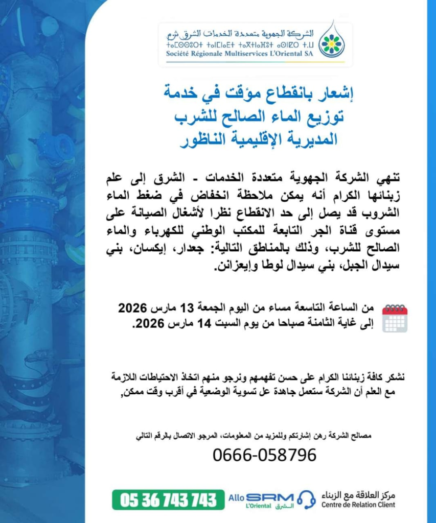 وأفادت الشركة الجهوية متعددة الخدمات – الشرق، المديرية الإقليمية بالناظور، في إشعار موجه إلى زبنائها، أنه من المرتقب تسجيل انخفاض في ضغط الماء قد يصل إلى حد الانقطاع بعدد من المناطق، نتيجة تدخل تقني يهم أشغال الصيانة على قناة الجر، وذلك في إطار ضمان استمرارية وجودة خدمات التزويد بالماء الصالح للشرب.