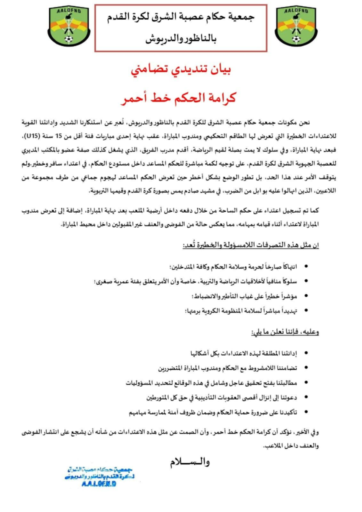 وفي هذا السياق، أعلنت جمعية حكام عصبة الشرق إدانتها المطلقة لهذه الاعتداءات، معبّرة عن تضامنها اللامشروط مع الحكام ومندوب المباراة المتضررين، مطالبة بفتح تحقيق عاجل وشامل لتحديد المسؤوليات.