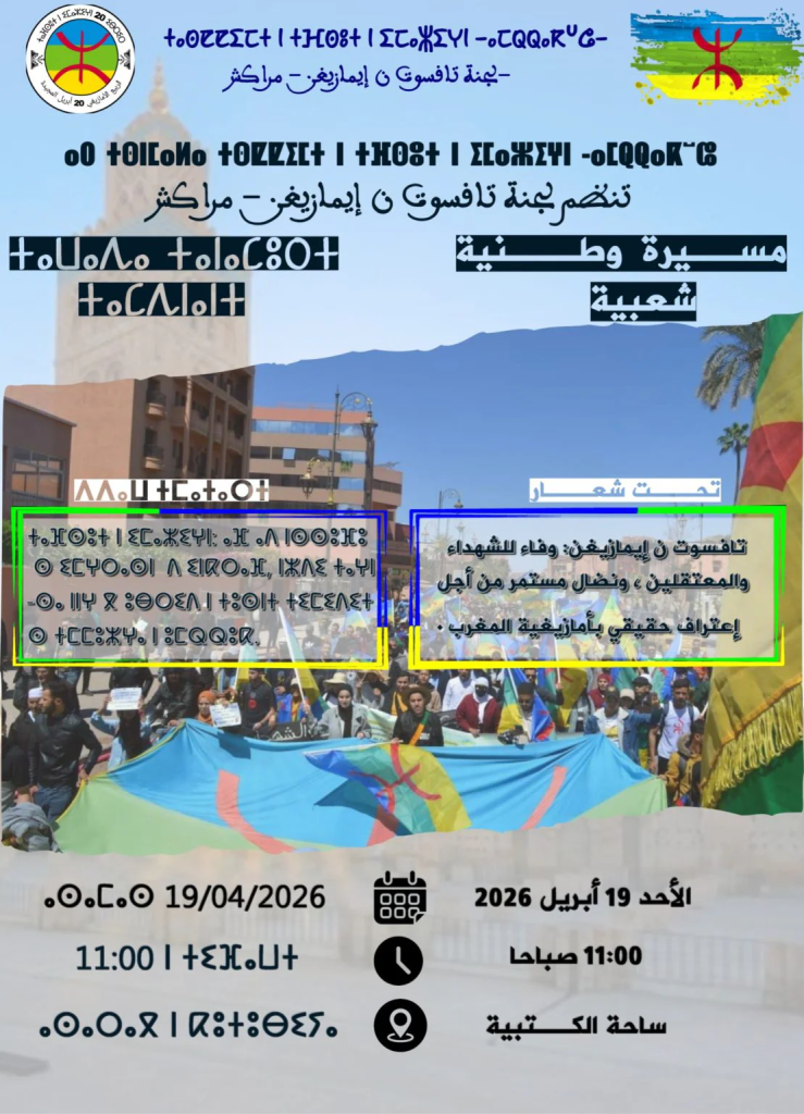 أعلنت “لجنة تافسوت ن إيمازيغن – مراكش” عن تنظيم مسيرة وطنية شعبية يوم الأحد 19 أبريل 2026، على الساعة 11 صباحًا، انطلاقًا من ساحة الكتبية بمدينة مراكش، وذلك تخليدًا للذكرى الـ46 للربيع الأمازيغي، تحت شعار: “تافسوت ن إيمازيغن: وفاء للشهداء والمعتقلين ونضال مستمر من أجل اعتراف حقيقي بأمازيغية المغرب”.